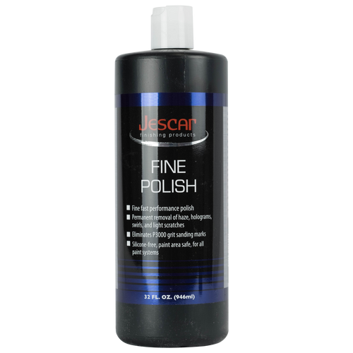 Fast finishing machine polish developed using an advanced formula for permanent elimination of swirls, holograms, haze, and light scratches without fillers. For heavy defect removal use Jescar compound and then follow with Jescar Fine Polish for a flawless high gloss surface. Eliminates P3000 grit sanding marks on fresh paint or swirl marks from prior compounding. Suitable for all paint systems. Use with a polishing foam pad with a rotary or dual action polishing machine. Silicone-free and safe for all paint areas.