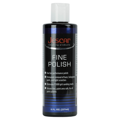 Fast finishing machine polish developed using an advanced formula for permanent elimination of swirls, holograms, haze, and light scratches without fillers. For heavy defect removal use Jescar compound and then follow with Jescar Fine Polish for a flawless high gloss surface. Eliminates P3000 grit sanding marks on fresh paint or swirl marks from prior compounding. Suitable for all paint systems. Use with a polishing foam pad with a rotary or dual action polishing machine. Silicone-free and safe for all paint areas.