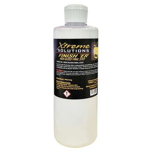 Directions: Shake well. Be sure the surface is clean, cool and dry. Apply a moderate amount of Finish ‘Er to a wool, microfiber, or foam buffing pad. Spread evenly over a 2ft by 2ft area. Buff slowly, applying even pressure. Allow Finish ‘Er to flash off, then buff to a high shine.