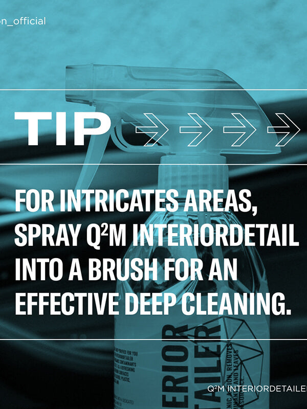That's right, all surfaces! Q²M Interior Detailer is the ideal interior maintenance product to remove light grime, contaminants, and leave a fresh and purified interior feel. It’s safe on leather, plastic, Alcantara, textiles, glass, LCD touch panels, instrument panels, and all types of interior trim. It will leave a matte and non-sticky finish.