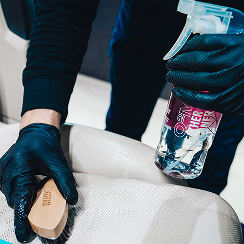 Use GYEON Leather Cleaner Strong for stubborn stains and dirt. Use the leather brush to clean perforations.