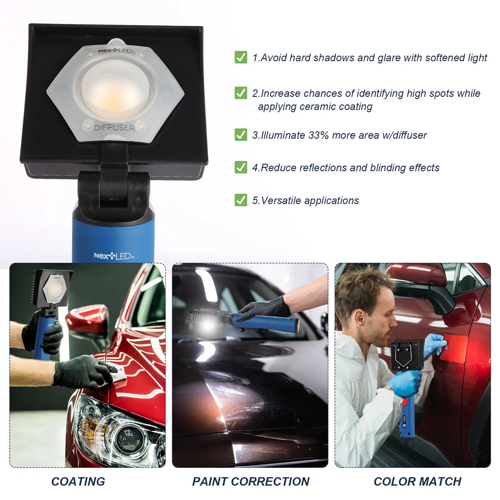 [Enhanced Visibility with Detachable Diffuser] - The removable diffuser increases the light area by 33%, reducing glare and improving visibility of streaks, high spots, and imperfections, making it an ideal complementary tool for car ceramic coating and ceramic spray coating for cars.