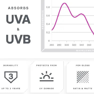 Compared to other plastic coatings, DLight is enhanced with powerful UV absorbers and light stabilizers, offering a broad rejection spectrum of 260nm to 360nm to block the most damaging UVA and UVB light. This advanced protective layer shields delicate surfaces from harmful ultraviolet rays, helping to prevent yellowing, fading, and cracking over time. Engineered for durability and clarity, the coating not only preserves the pristine appearance of headlights, paint protection film (PPF), and plastic trims, but also ensures long-lasting performance by preventing gloss loss, discoloration, and enhancing scratch resistance.