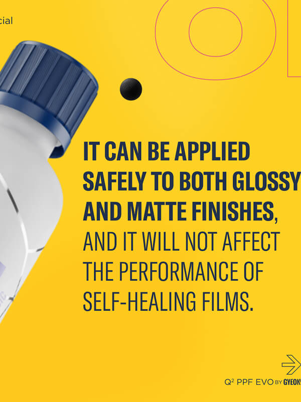 Q² PPF EVO has been designed to perform with all modern paint protection films, including coated and self-healing versions. It will enhance the color on both glossy and matte film without changing the finish.