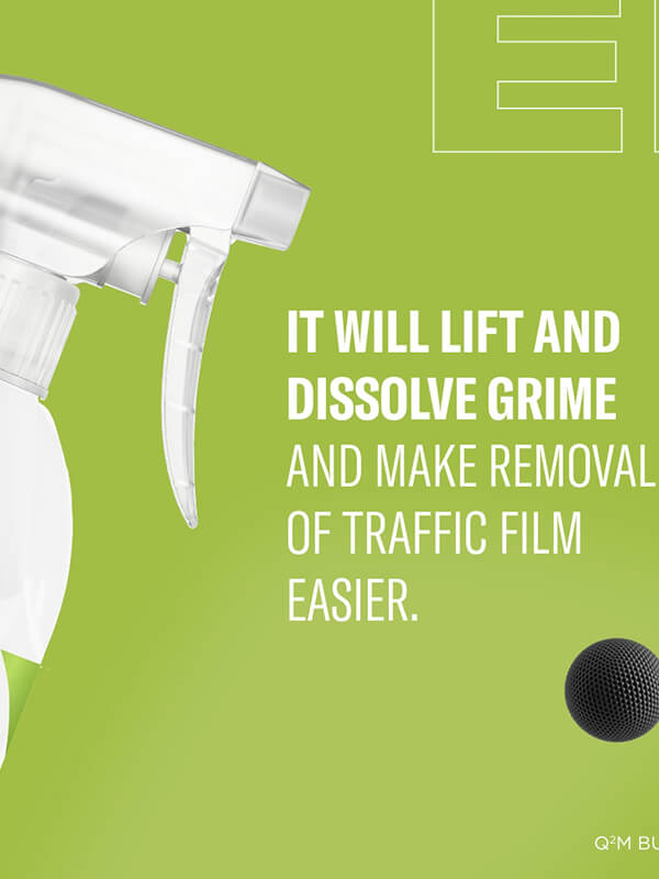Q²M Bug&Grime can be used as a strong and effective pre-spray during the initial steps of a thorough wash. Simply leave it on the surface and then rinse it off. It's also a fantastic aid during a more intensive cleaning process and will remove old and heavily settled dirt when agitated with a gentle brush.