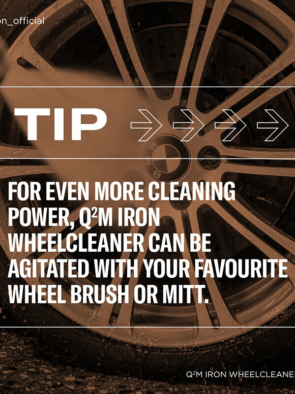 BEST PRACTICE AND PRO-TIPS FROM YVES HEYLEN: Always use Q²M Iron WheelCleaner Redefined on a cool wheel and avoid direct sunlight. Liberally spray it on the wheel and brake caliper, letting it dwell for 1 to 2 minutes before rinsing heavily. TIP: For even more cleaning power, agitate Q²M Iron WheelCleaner Redefined with your favorite wheel brush or mitt.
