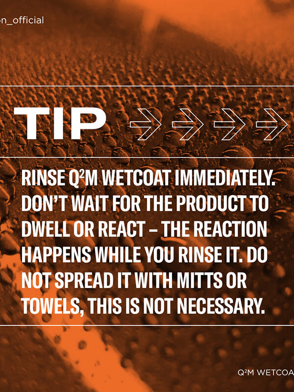 Q²M WetCoat is a revolutionary spray coating that provides instant and durable protection in minutes. Simply spray on and rinse off. The real advantage is the significant hydrophobic and self-cleaning effect that is delivered immediately, along with an intense gloss and shine on painted surfaces.