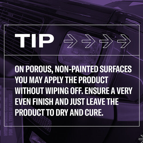 BEST PRACTICE AND PRO-TIPS FROM YVES HEYLEN: Q² Trim EVO is more than just a protective coating; it boasts powerful restorative and color enhancement qualities. TIP: On porous, non-painted surfaces, you can apply the product without wiping it off. Ensure a uniformly even finish and allow the product to dry and cure. This will maintain its initial appearance for months! For trim with a porous structure, use a foam applicator for an even finish.