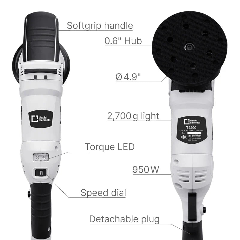 Whether you’re removing scratches, eliminating holograms, or chasing a mirror-like gloss—the “T4200” dual-action polisher is the ideal choice for anyone who prizes quality and efficiency. Its rugged build and versatile features make it indispensable in vehicle care. Experience the outstanding performance and precise handling of the “T4200”—for results that leave nothing to be desired.