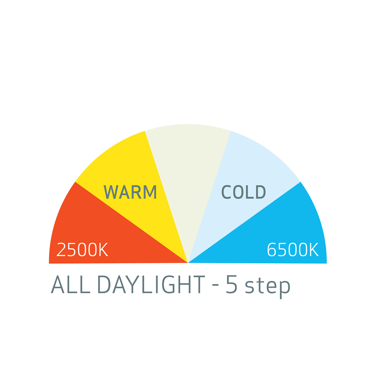 Featuring an ALL DAYLIGHT function, the headlamp offers 5 different colour temperatures depending on the task at hand. By pressing the CCT button on the side, you can change the colour temperature from 2500 to 6500 K, and the setting is indicated by the diodes on top of the headlamp. The headlamp also includes a stepless dimmer function that allows you to adjust the light output between 10% and 100%.